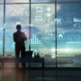 A silhouette of a man stands on the background of large office windows and views a hologram of corporate infographic with work data.