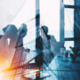 Business people collaborate together in office. Double exposure effects